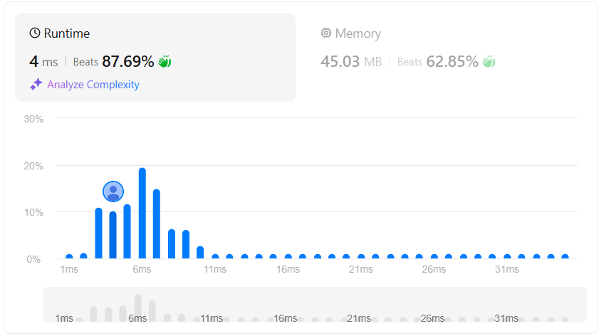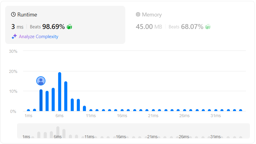 우선 이 코드의 작성자가 올려준 코드를 그대로 실행시키면 3ms의 실행 시간을 가지는 코드였다. 그러나 몇몇 부분을 보기 편하게 리팩토링 하면서 같이 수정한 부분이 있는데 그 수정으로 인해 1ms 느려지게 되었다.