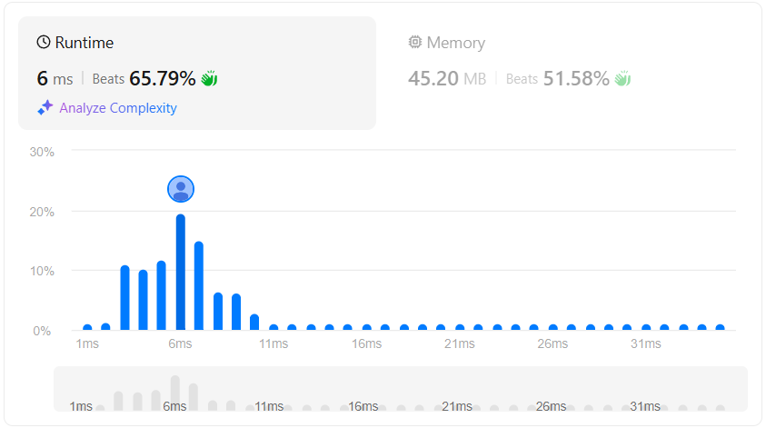 실행 시간은 6ms로 대부분의 코드가 해당 시간으로 해결된 것을 볼 수 있다.
